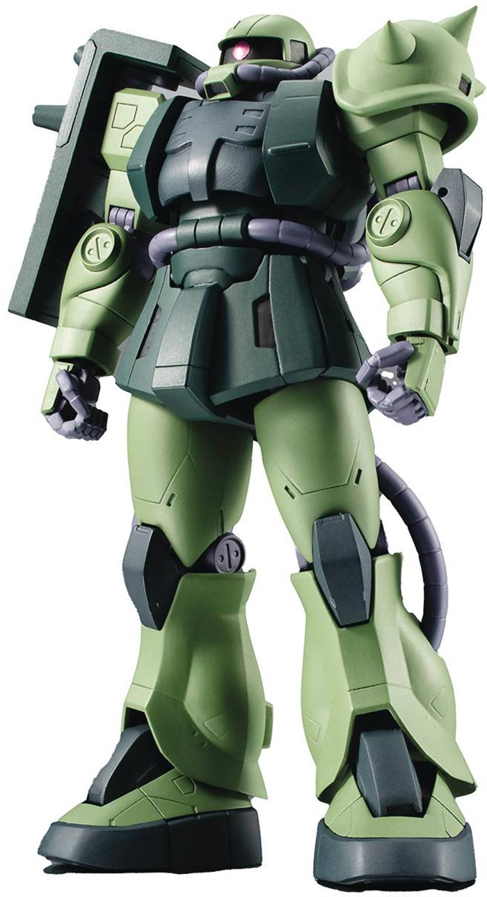 Description: Deployed in Zeon's Southeast Asian Forces, this enhanced version of the venerable Zaku Ground Type wreaked havoc against the Earth Federation Forces' Kojima Battalion - and now it's joining the ver A.N.I.M.E. series! Unlike its predecessor, the Type J, the Type JC was redesigned with ground combat in mind, rebalanced for fighting on all sorts of terrain and re-armed with a superior bazooka and anti-infantry weapons. Included are: four pairs of optional hands, hand storage deck, 120mm zaku machinegun, zaku bazooka, heat hawk (ignited), heat hawk (stored), optional shield cover, various connector joints, and two thruster effects. .