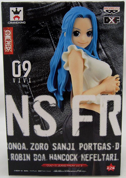 Description: From Banpresto. Banpresto continues its series of figures based on the world renowned anime show One Piece: "Jeans Freak," which has your favorite One Piece characters wearing their favorite jeans. Nefeltari Vivi was selected as the ninth character for the series by the votes of One Piece fans, and her jeans are worn as a stylish denim ankle-length skirt with an alluring cut up the side. Figure A (Black Jeans) and Figure B (Blue Jeans) come with figure stands.