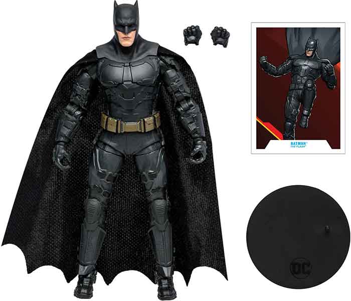 Description: This incredibly detailed 7" scale figure based off The Flash movie is designed with Ultra Articulation with up to 22 moving parts for full range of posing and play. Batman includes alternate hands, cloth cape, and base, along with an included collectible art card with character art on the front, and character biography on the back. Collect all McFarlane Toys DC Multiverse Figures! .