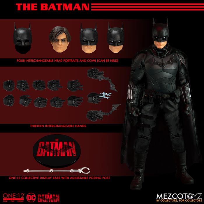 Description: One:12 Collective! The Batman is outfitted in a screen-accurate armored Batsuit with chest insignia. The costume features an integrated posing wire in the cape, utility belt, a thigh pouch, and two vambrace. Batman comes complete with four head portraits including an unmasked Bruce Wayne portrait, all featuring the likeness of actor Robert Pattinson. Equipped with multiple Batarangs, sticky bombs, handcuffs, grapple launcher, and smoke bombs, Batman fights crime in the wet and grimy streets of Gotham. Each One:12 Collective The Batman figure is packaged in a collector friendly box, designed with collectors in mind..