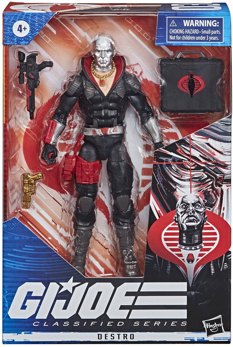 Description: This Destro figure comes ready for action, with multiple points of articulation for high poseability and character-inspired accessories, including a golden decoed blaster. And with custom artwork by Oliver Barrett, the G.I. Joe Classified Series Destro package will make a mark on shelves.