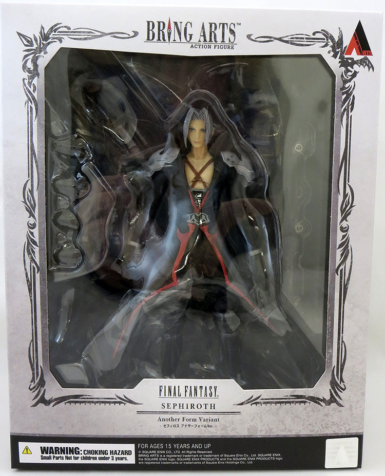 Description: From Square Enix. FINAL FANTASY VII antagonist Sephiroth who had wandered into another world now joins the fray as a BRING ARTS figure. This 3D recreation of Sephiroth, which pair's with Cloud from the same series, is also based on the illustration by Mr. Tetsuya Nomura. The brilliant detail on his impressive wing gains depth with it colorization. The range of expression is increased by interchanging the two types of wings that come with the figure. The rich amount of accessories also includes Sephiroth's favorite sword, Masamune, and four interchangeable hands. Enjoy various poses to match any scene or imagination. Figure includes display stand