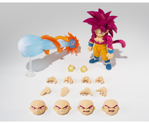 Description: Now available from S.H. Figuarts, from the anime series “Dragon Ball Daima” is Super Saiyan 4 Son Goku (Mini)! This figure boasts a completely new design depicting Goku unleashing his new powers! Even with its compact height of approximately 80mm, the movable design developed for the S.H. Figuarts Dragon Ball series allows you to relive the countless action scenes you’ve seen in the series. Among the exchangeable facial expressions are normal, as well as grinning and clenched teeth. Two shouting facial expressions with different mouth shapes are also included. You can use them to recreate the series of Kamehameha poses Goku showed to Third Eye Gomah. It also comes with four sets of exchangeable hand parts left/right, and as an added bonus, there are exchangeable hand parts left/right with energy bullets that you can use with the S.H. Figuarts Son Goku (Mini) Daima figure (sold separately), too..