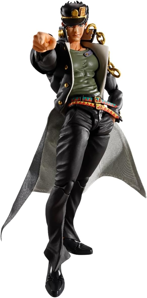 Description: Jotaro Kujo, protagonist from the wildly popular JoJo's Bizarre Adventure: Stardust Crusaders, joins S.H.Figuarts! This culmination of S.H.Figuarts technology utilizes movable mechanisms to enable iconic poses and action poses. Tamashii Digital Coloring Technology has been utilized to fully express his facial features. A special pedastal with an original design print is also included. The hem of his fluttering school uniform can be freely positioned using the PVC sheet with wires. [Set Contents] Main body, 6 pairs of interchangeable hands, 2 interchangeable expression parts, Connection parts for pockets (L/R), Dedicated stand.