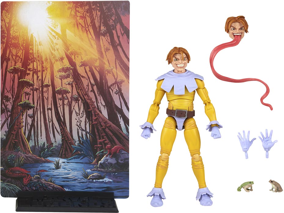 Description: A wicked-tongued classic X-Men villain comes to life with the 6-inch Series 1 Marvel's Toad figure, inspired by the character's appearances throughout Marvel Entertainment! This 6-inch scale figure is inspired by the original 2002 Marvel Legends Marvel's Toad figure, featuring updated articulation, deco, and accessories. Toad figure comes with 5 accessories, including alternate head with his signature mutant tongue, and a comics-inspired reversible backdrop and stand for display!.