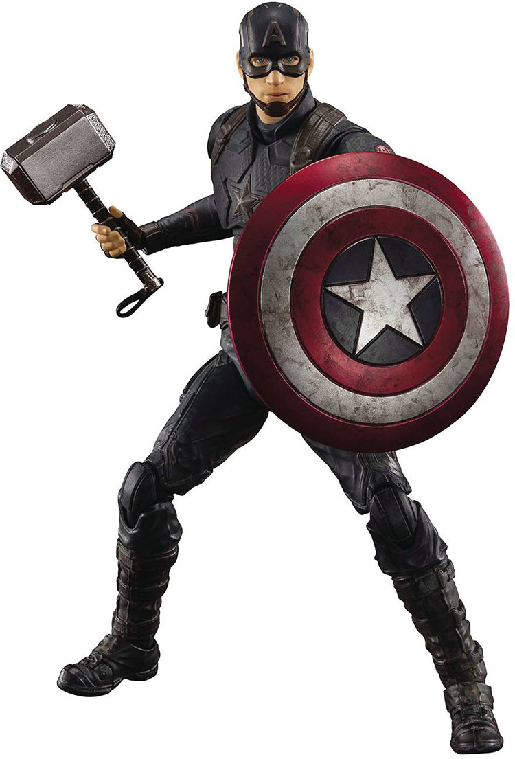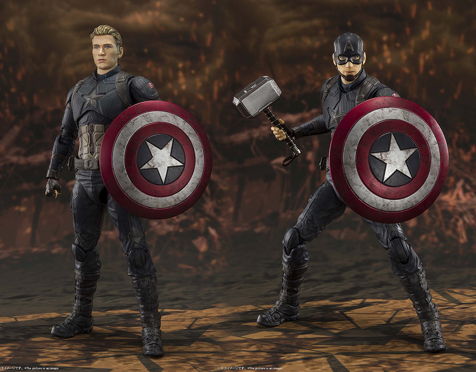 Description: From Tamashii Nations. S.H.Figuarts gets even more dramatic! Captain America, as seen in his final form in the epic Avengers: Endgame, joins the series! Now you can replicate the film's thrilling climax in which Cap himself wields Thor's mighty hammer Mjolnir! The accurately detailed and highly posable figure includes a shield, a shield strap, four optional pairs of hands, two optional heads, a broken shield, Mjolnir, and a Mjolnir effect part.