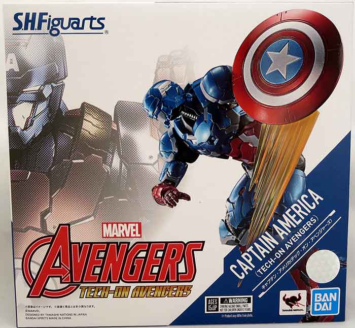 Description: Captain America from "Tech-On Avengers" joins S.H.Figuarts! Entirely re-envisioned by artist Eiichi Shimizu, this Captain America features a metallic finish and a frame incorporating diecast metal parts. Packed with effects and accessories, it also lets you replicate the Tech-On Avengers' trademark DH-10 Mode. [Set Contents] Main Body, Four pairs of optional hands, DH-10 Armor, Shield (normal), Shield (DH-10), Shield effect parts, Chest effect parts, Optional sleeves, Shield joint set, Shield throwing effect , Fist effect parts, Repulsor effects (feet) (x2), Repulsor effects (hands) (x2), Stand.