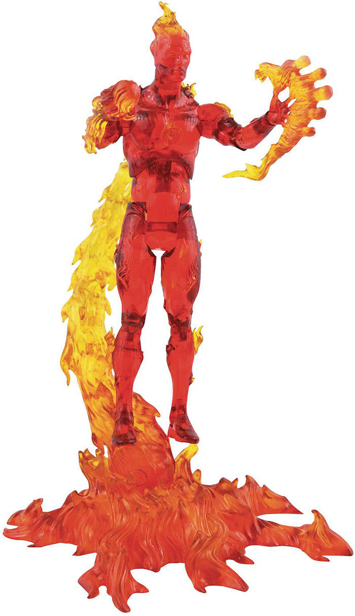 Description: A Diamond Select Toys release! Flame on! The Fantastic Four's hot-headed member gets his first-ever Marvel Select action figure with this all-new release! Standing approximately 7 inches tall and featuring 16 points of articulation, this figure is cast in translucent material, and comes with interchangeable flame effects, a flight stand and a Golden Age Torch head! It comes packaged in display-ready Select packaging, with side-panel artwork for shelf reference. Designed by Eamon O'Donoghue, sculpted by Chris Dahlberg! .