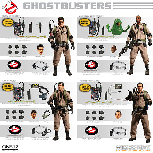 Description: They ain't afraid of no ghost! Mezco welcomes everyone's favorite parapsychologists into the One:12 Collective with a five-figure deluxe set - all four Ghostbusters plus a supernatural bonus figure: Slimer! Each Ghostbuster comes with their own light-up proton pack and is packaged in a special edition, collector-friendly metal tin, perfect for displaying alongside the troop! The One:12 Ghostbusters Deluxe Box Set features all four heroes, each boasting two head portraits: one natural and one scared expression, and also features the likeness of Bill Murray, Dan Aykroyd, Harold Ramis, and Ernie Hudson. Each of the 4 paranormal paladins comes with their own proton pack with a light-up feature, perfect for pesky encounters with ectoplasmic entities. Simply press the button on the proton pack to activate! No detail was overlooked when designing the Ghostbusters' uniforms which feature working zippers, functional pockets, nametags, and the Ghostbusters logo.