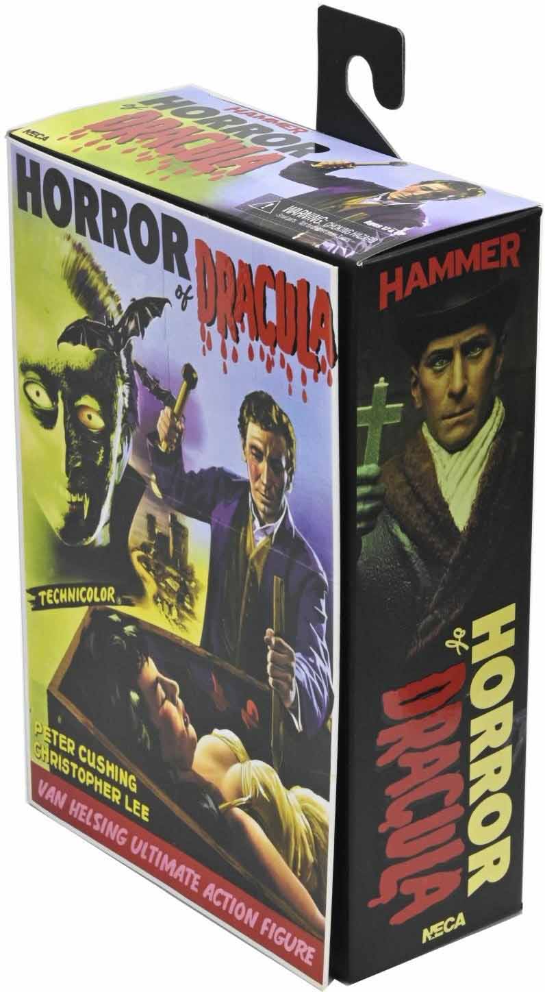 Description: NECA presents the second in a series of action figures from the legendary Hammer House of Horror! Hammer has produced landmark horror since the 1950s, with the first being Horror of Dracula. The film captured audiences with its mix of vivid color, carnality, and violence. Peter Cushing plays the iconic character Van Helsing, who is sent to destroy Dracula, as played by Christopher Lee. This Ultimate Van Helsing stands in 7-inch scale and features an interchangeable waist for an alternate look in either his vest or long coat. Accessories include interchangeable heads, hands, and gloved hands, as well as a cross, hammer, wooden stake, wooden stake bundle, and two candle holders. Comes in collector-friendly window box packaging with opening front flap..