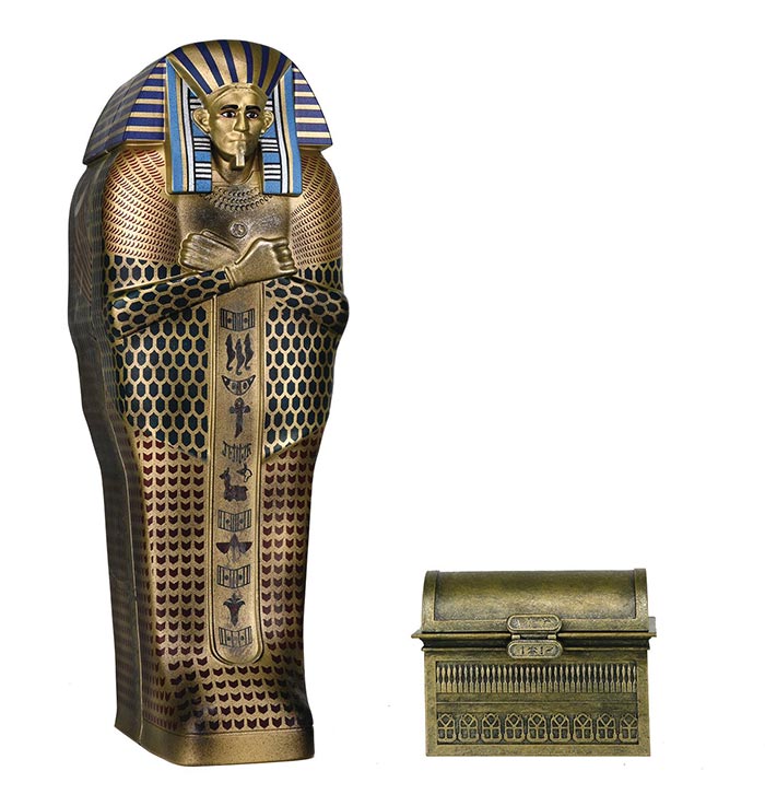 Description: Build even bigger scenes and dioramas with this accessory set for NECA's Universal Monsters: The Mummy action figure! The star of the set is the elaborate sarcophagus, which measures over 9" inches tall and has a removable lid with movie accurate deco and intricate printed pattern. The set also includes a larger opening chest that measures 2.5"x 3". Closed box packaging. (Figure sold separately.).