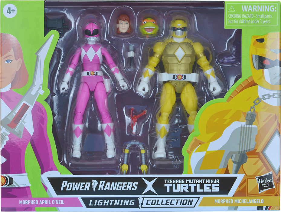 Description: This 6-inch Lightning Collection MMPR x TMNT Collab 2-pack features action figures with premium paint and decorative details inspired by the Boom! Comics crossover miniseries, with over 20 points of articulation in each figure for high poseability. Plus, swappable heads to display the Teenage Mutant Ninja Turtle and April with Ranger helmet or without. Also includes multiple character-inspired weapon accessories, blast effect pieces, and extra pairs of hands for more ways to play or display. . TMNT