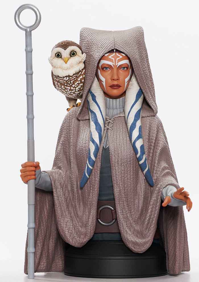 Description: The Togruta returns! As seen in Star Wars: Rebels, Ahsoka Tano appears, dressed in a tan robe and holding a staff with a Convor on her shoulder. This 1/6 scale, approximately 6-inch resin mini-bust features detailed sculpting and paint applications, and is limited to only 3000 pieces. It comes packaged with a certificate of authenticity in a full-color box..