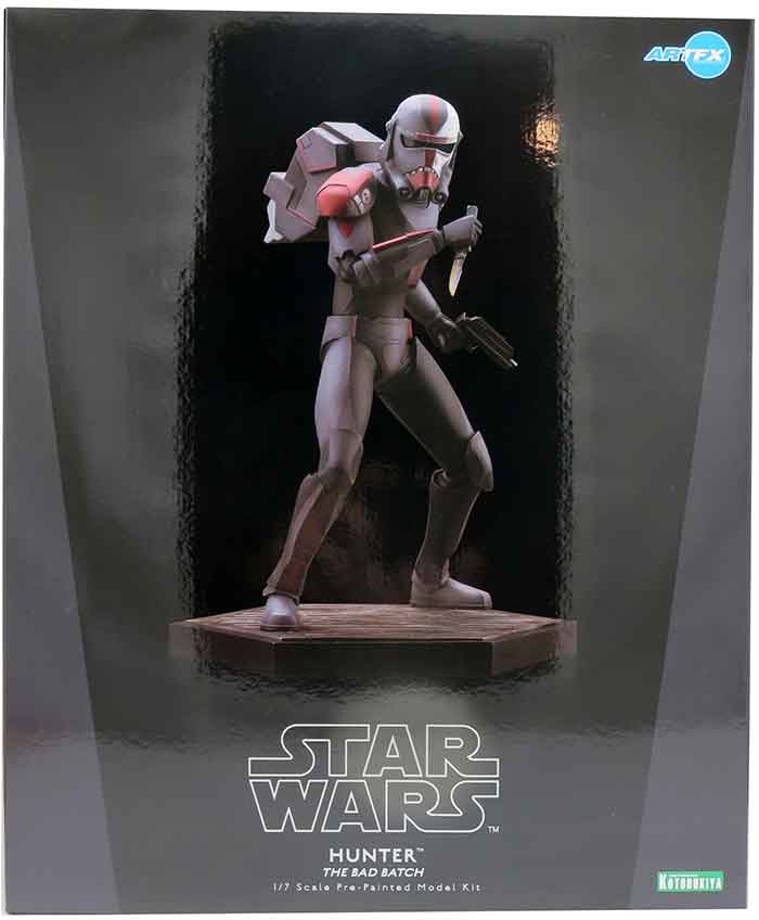 Description: From the popular animated series streaming on Disney+, Star Wars: The Bad Batch, Kotobukiya presents a series of 1/7-scale model kits! Hunter, their leader, was engineered with heightened senses, making him an expert tracker. Hunter, with his shaggy hair and skull tattoo, stands out among the members. Details like the skull emblem, and the sheath from this vibro-knife on his left arm are carefully sculpted in 1/7-scale. You can display this piece with the knife from ARTFX Star Wars Wrecker in his left hand (knife not included in this product). An interchangeable head part without the helmet is also included. The base is of a hexagon shape design that will be standard to all future characters in this series so fans can enjoy lining them up together on display. .