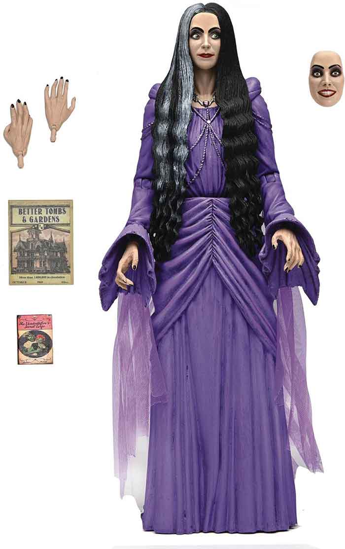 Description: The Munsters, NECA introduces Lily Gruesella-Munster as an Ultimate action figure! After a failed date with a familiar face, Lily discovers comedian sensation Herman Munster, and it's love at first fright. Much to her father's dismay, the two marry and, after a hairbrained scheme by a hairbrained brother, set their sights on Hollywood. This 7" scale action figure fits perfectly with the rest of the NECA Munsters Ultimate line, and includes a soft goods accents, interchangeable face plate expressions, alternate hands, book, and magazine. Comes in display friendly 5-panel packaging with opening front flap featuring custom artwork by Daniel Horne.