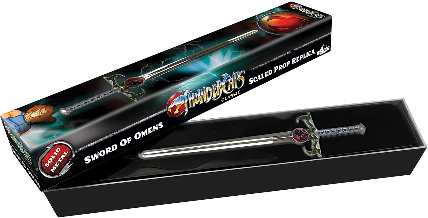Description: Factory Entertainment presents a high quality officially licensed scaled prop replica of the Sword of Omens from ThunderCats. This stunning 8" heavy duty scaled prop replica is molded out of solid metal, comes in collector packaging and features a display stand..