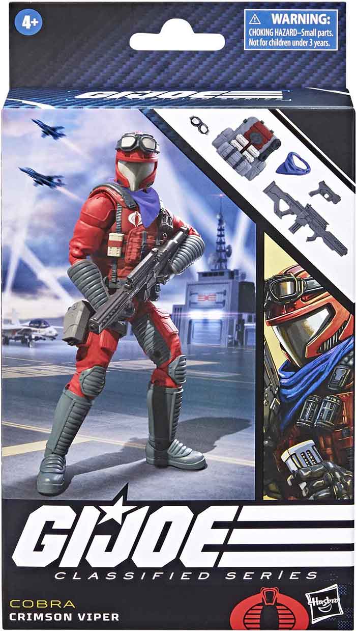Description: New to the G.I. Joe Classified Series line, Crimson Viper comes ready for adventure, with multiple points of articulation for high poseability. This Crimson Viper figure contains 5 character-inspired accessories including backpack, bandana, goggles, and 2 weapon accessories; plus a footlocker to stow all his gear! Professing loyalty to the secret cabal formed by the Baroness, Tomax, and Xamot, Crimson Vipers are hand-selected not only for their superior skills and ruthless efficiency, but also for their overwhelming greed. "We attack like a crimson tide washing over the battlefield, leaving only destruction in our wake..