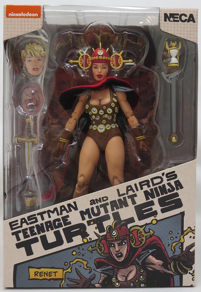 Description: Based on the classic Teenage Mutant Ninja Turtles comic books from Mirage by Kevin Eastman and Peter Laird! This apprentice Time Master prefers playing hooky to hitting the books, and meets the Turtles while skipping out on her studies. But Renet has a lot to learn before she can become Mistress of All Time, and proceeds to lead them on a merry misadventure! The Renet action figure stands approximately 6" tall, and includes soft goods cape, interchangeable heads and hands, Time Scepter, assorted weapons, and more! Comes in special comic-book tribute window box packaging illustrated by Kevin Eastman..