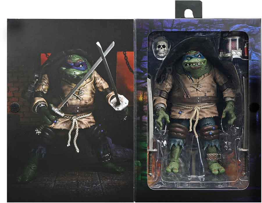 Description: He's the brains behind the Monster... and he has the jar to prove it! NECA is thrilled to announce a new addition to its Universal Monsters x Teenage Mutant Ninja Turtles action figure collection! Leonardo as The Hunchback reimagines the Turtle as Ygor, faithful assistant to the great Dr. Frankenstein... Or so he would have you believe! For this menacing mastermind has nefarious plans inside even more nefarious plans, and he doesn't even need to hide them up his sleeve - there's plenty of space on his back! Yes, the massive shell of The Hunchback opens to store the many included accessories: brain in a jar, two katanas, interchangeable hands, shovels, bone, skull, and flame effects that attach to the katanas to form torches... all tools in his sinister plans for revenge on the mysterious vampire cult that disfigured him. Comes in collector-friendly window box packaging with opening flap featuring a custom illustration..