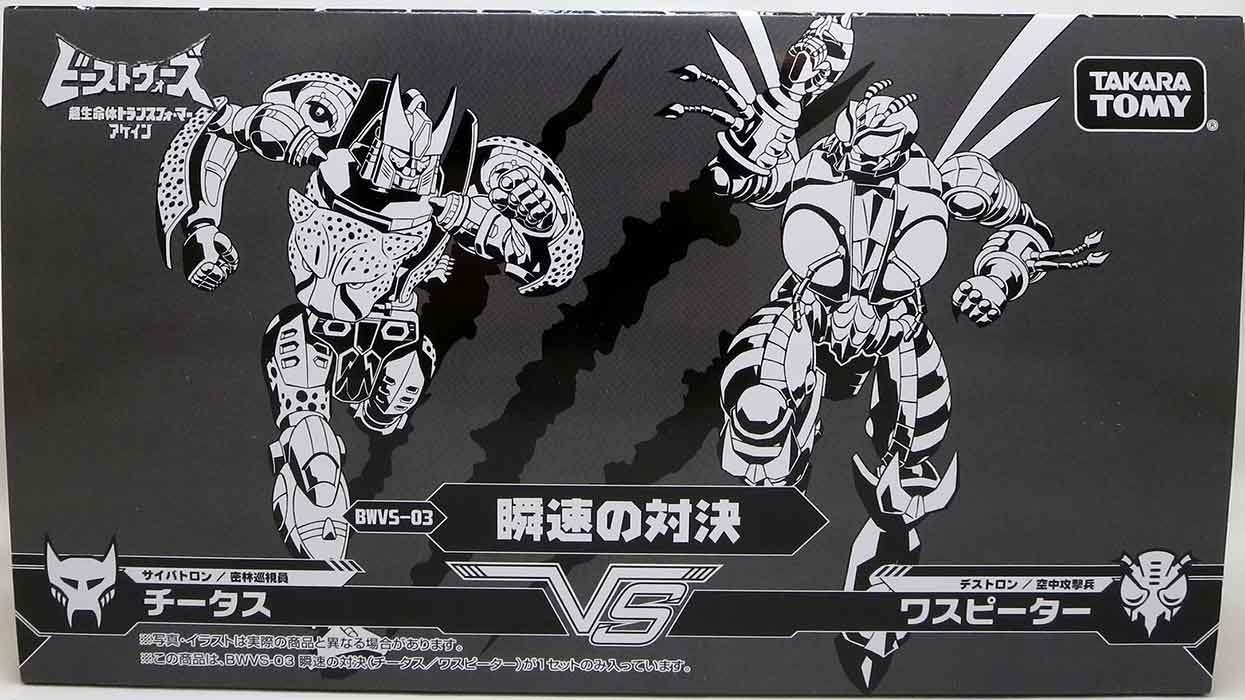 Description: Bring the ultimate Transformers experience to your collection with Transformers BWVS-03 Cheetor vs. Waspinator 2-Pack! These collectible Transformers action figures feature authentic Takara Tomy design and deco. The Cheetor figure's tail detaches to become a tail whip accessory while Waspinator's stinger detaches to become a stinger blaster accessory. The figures come showcased in premium packaging with Japanese-language instructions. .