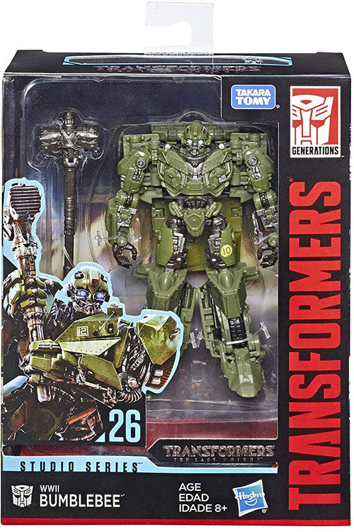 This Studio Series 26 Deluxe Class Transformers: The Last Knight WII Bumblebee figure converts from robot to tank mode in 25 steps. Remove backdrop to showcase WWII Bumblebee in the WWII Flashback scene. Figure features vivid, movie-inspired deco and includes detailed weapon accessories: a blaster and a hammer modeled after the weapons Bumblebee uses in the film.