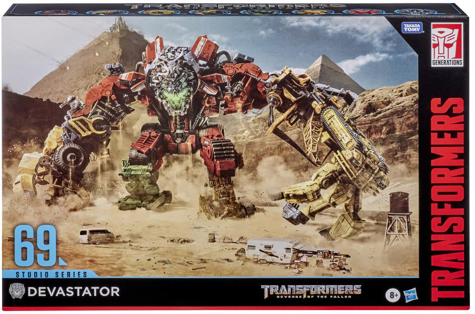Description: This Studio Series 69 Devastator 8-pack features all 8 collectible Constructicon figures inspired by Transformers: Revenge of the Fallen with additional movie-inspired deco that did not appear in the original releases. The figures combine to form the Devastator figure in 11 steps. Figures also convert between robot and construction vehicle modes. Remove extra-large backdrop to showcase the massive Devastator in the Pyramid Desert Battle scene. Includes 3 detailed accessory. Includes: 8 figures, 3 accessories, removable backdrop, and instructions..