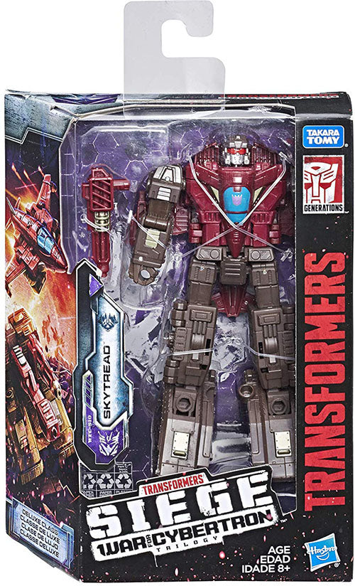 Description: The WFC-S7 Skytread figure features story-inspired battle-worn deco and is equipped with a HV Electron Breacher weapon accessory and a EM24 IR Laser Launcher weapon accessory. The 2 weapon accessories mod-lock together to form the larger LRRF Suspension-Ray Super-Launcher. Multiple C.O.M.B.A.T. System weapons ports in bot and vehicle modes allow fans to attach weapons to figure in custom weapon configurations.