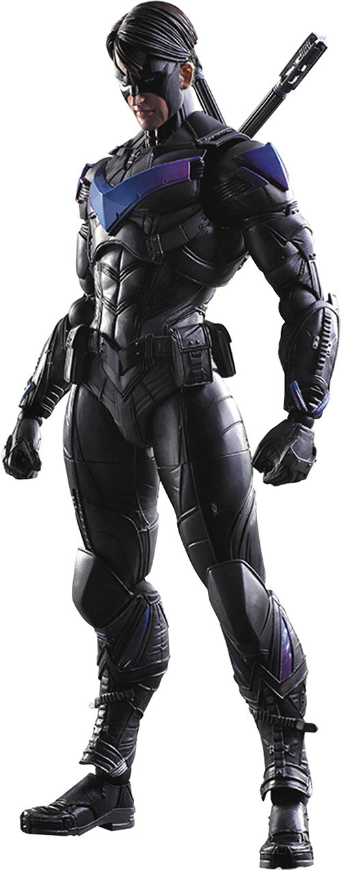 Description: From Square-Enix. Armed with his acrobatic abilities, Nightwing fights against formidable villains. Our designers paid meticulous attention to the fine details of his armored suit to render his nimble yet strong physique. The paintwork places heavy emphasis on the texture of each material, from the complexities of the various fabrics to the life-like skin tone. Nightwing comes equipped with his gadgets, including his Escrima Sticks, which can be stowed away on his back using an adapter piece. This figure also has a very wide range of mobility in order to recreate Nightwing's flashier action poses. The metallic, almost iridescent accent colors in his chest and shoulders shimmer brightly, as if to show off his distinctive identity. Window box packaging.