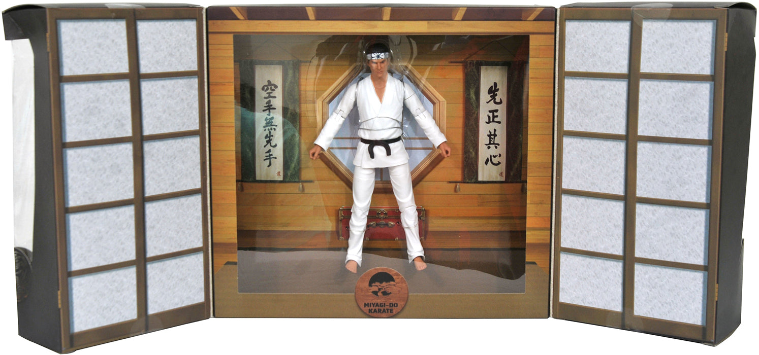 Description: Strike Fast! Strike Hard! No Mercy! Fans of the Netflix series Cobra Kai can enter their favorite dojo with this debut box set of Cobra Kai action figures! The front of the box shows Johnny Lawrence and John Kreese in the Cobra Kai dojo, but open it up farther and see Daniel LaRusso in the Miyagi-Do Karate dojo! Each 7-inch action figure comes with interchangeable hands and display stands, and the box comes packaged in a protective sleeve. Figures sculpted by Chris Dahlberg and Rocco Tartamella. Package design by Jack Tsai!. Karate Kid