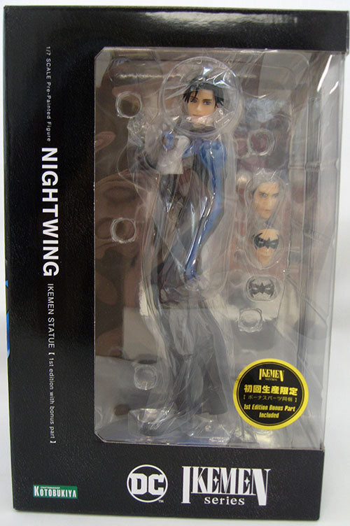 Description: From Kotobukiya. Kotobukiya's new statue series the IKEMEN begins with Nightwing! Similar to Kotobukiya's popular Bishoujo series, the IKEMEN series is a lineup of popular characters re�-designed by the famous Japanese illustrator, Ricken, into the Japanese ikemen (handsome men) style! These PVC statues are perfect for display alone or alongside other Kotobukiya Bishoujo and IKEMEN statues! Sculpted by the talented Naoya Muto, Nightwing poses with his finger to his lips as if asking you to keep his identity a secret. He comes with three total interchangeable head parts so you can display him with or without his mask.
