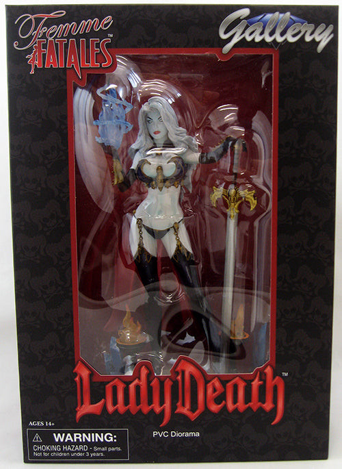 Description: A Diamond Select Toys Release! All hail Lady Death! Brian Pulido's creation comes to life in a new Femme Fatales PVC Diorama! Depicting her wielding a ball of blue flaming energy, with one hand resting on a massive broadsword, this 9-inch sculpture is made of high-quality vinyl with exacting paint details, and comes packaged in a full-color window box. Sculpted by Sam Greenwell!