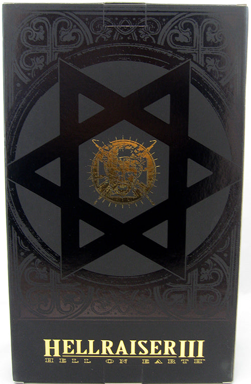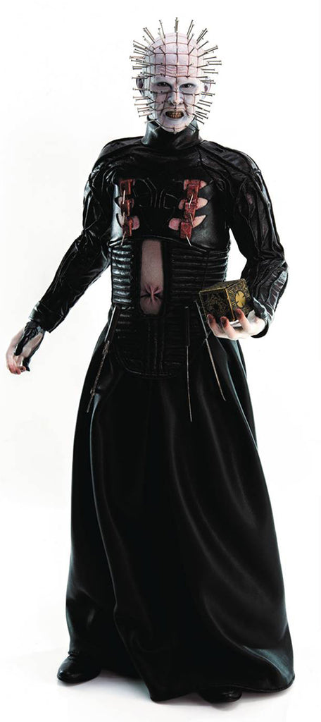 Description: From Threezero. This fully-poseable, 12" figure from the popular horror film series features a head sculpt with realistic likeness to the character portrayed from the movie Hellraiser 3, complete with real metal pins and hooks. An authentic, tailored replica of the Cenobite's striking black costume with delightfully chilling realism comes complete with gory hooks and piercings. Along with a disturbing inventory of bladed torture devices & scalpel hanging at his waist.The figure also comes with Lemarchand's Box (the Lament Configuration) and three interchangeable hands: outstretched (for holding Lemarchand's Box), relaxed and open with pins.