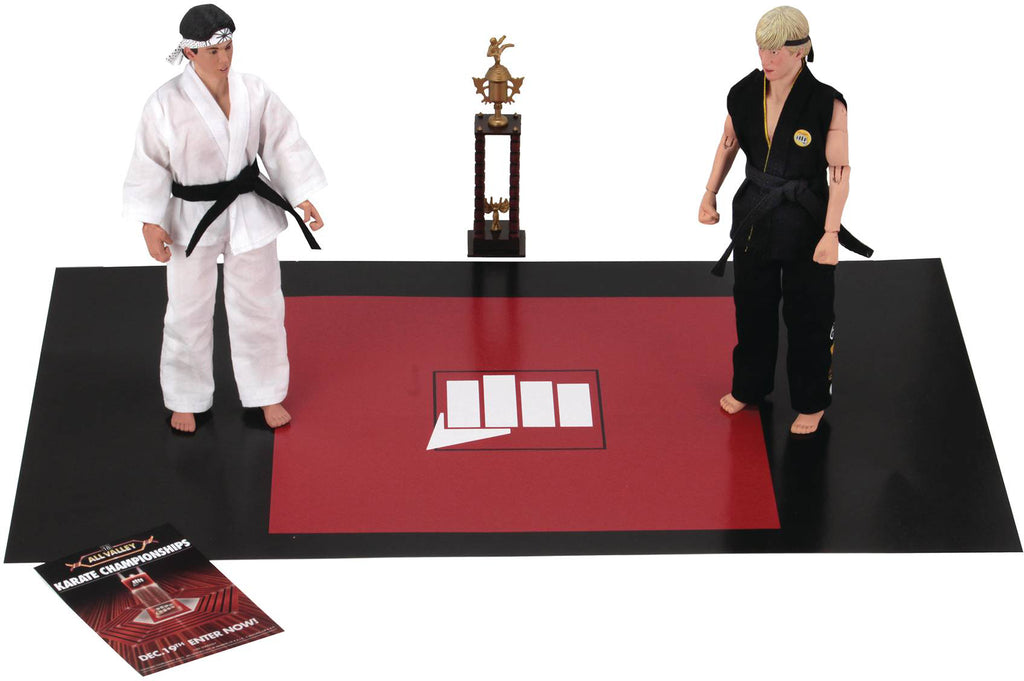 Description: From NECA. From The Karate Kid, the iconic '80s film that sent a generation of kids rushing to enroll in karate classes! These clothed action figures show Daniel and Johnny in their karate uniforms, ready to compete in the All-Valley Karate Championships. Included in the 2-pack is a trophy accessory, replica poster and floor mat. Each fully articulated figure stands approximately 8" tall and features an authorized likeness. Window box packaging.