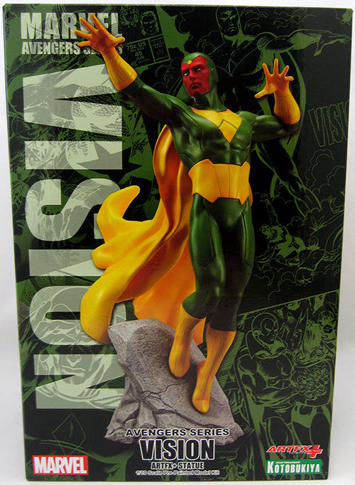 Description: From Kotobukiya. Kotobukiya's Marvel Comics ARTFX+ series has brought you a range of characters from the Avengers to the X-Men, Defenders, and more, with stunning detail in 1/10 scale. Now the spotlight returns to Earth's Mightiest Heroes with a new series of Avengers characters based on designs by Marvel superstar artist Adi Granov. An artificially created being known as a Synthezoid, Vision is a core member of the Avengers who appears in Marvel comics as well as the cinematic universe. Vision's unique vertical posing portrays him in flight, making the statue a perfect match for the previously released Scarlet Witch statue in the same series. At 1/10 scale, this statue is easy to display alongside the other affordable and highly collectible ARTFX+ statues, and the dynamic posing and diorama bases of the Adi Granov line make for an especially impressive display. Collect all of the Avengers as they prepare to take down Thanos!