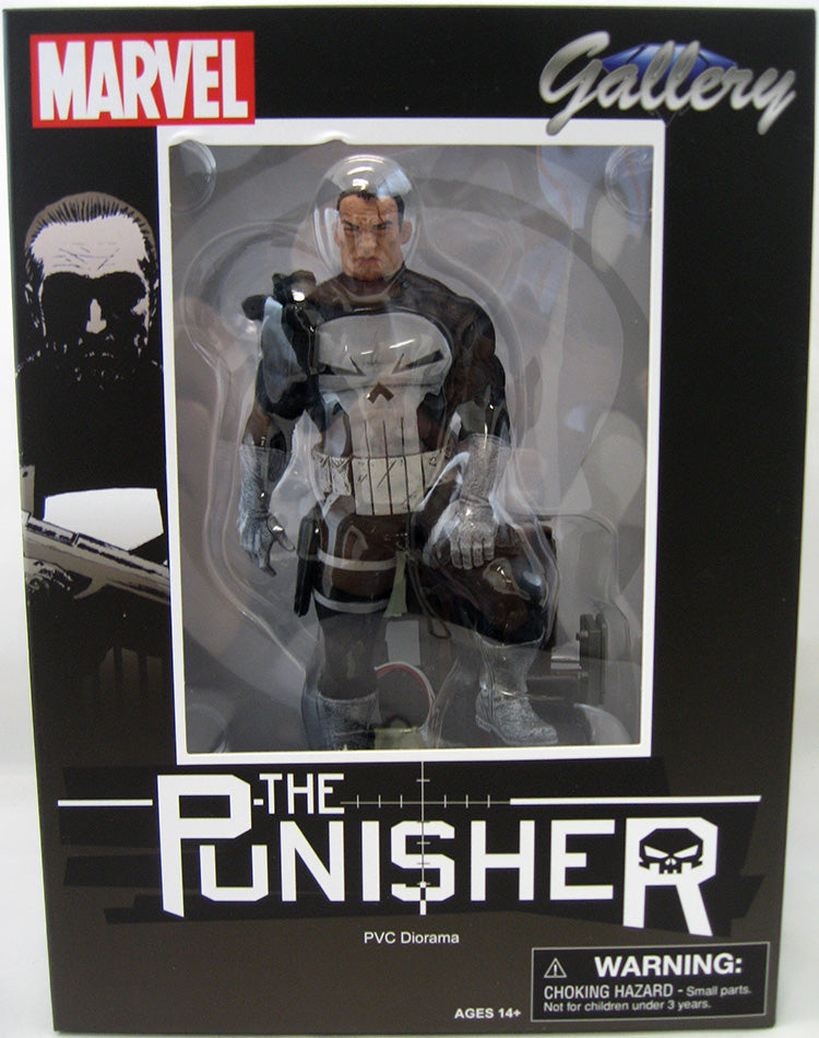 Description: A Diamond Select Toys release! The Punisher is getting ready to go out on a hit, and you are there! This all-new Gallery PVC diorama depicts the Punisher in his workshop, surrounded by tools, knives, jumper cables... everything Frank Castle needs for a successful night on the town. Based on his appearance in Marvel Comics, this PVC diorama measures approximately 9 inches tall and comes packaged in a full-color window box. Designed by Caesar, sculpted by Jonathan Matthews.