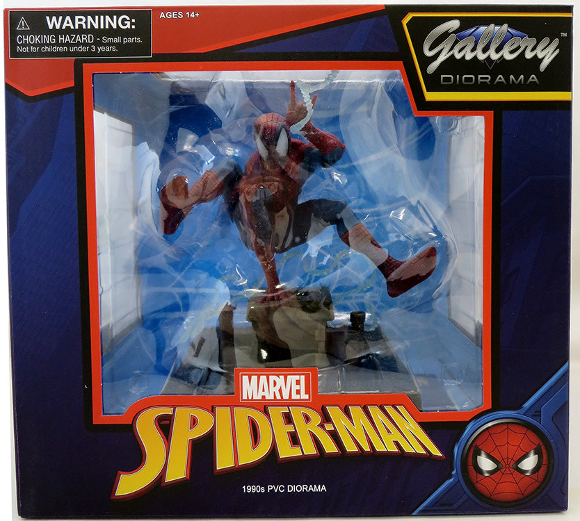 Description: A Diamond Select Release! Thwip! The spaghetti webs make s comeback in this new PVC Diorama inspired by classic Spider-Man artwork of the early 90s! Leaping over a rooftop with his webline wrapped around him, this sculpture of Spidey stands approximately 8 inches tall and is case in high grade PVC with highly detailed sculpting and paint applications. Packaged in a full color window box. Designed by Caesar, sculpted by Alterton!