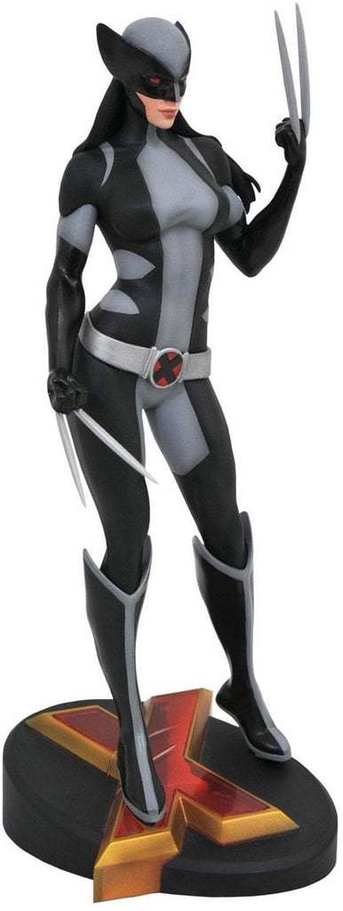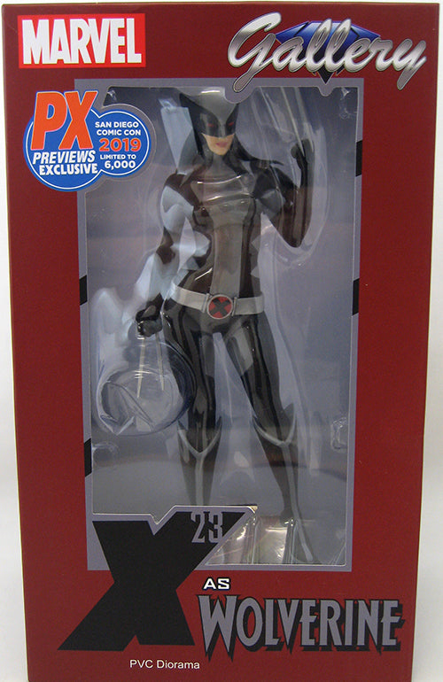 Description: She's back in black - and grey! Laura Kinney, a.k.a. X-23, a.k.a. the all-new Wolverine, changes her clothes in this Comic-Con-exclusive Marvel Gallery PVC Diorama. Striking a menacing pose in her grey-and-black X-Force uniform, Laura stands approximately 9 inches tall atop an X-logo base, and comes packaged in a full-color window box. Designed by Uriel Caton, sculpted by Sam Greenwell. Limited to 6,000 pieces. A Diamond Select Toys release!