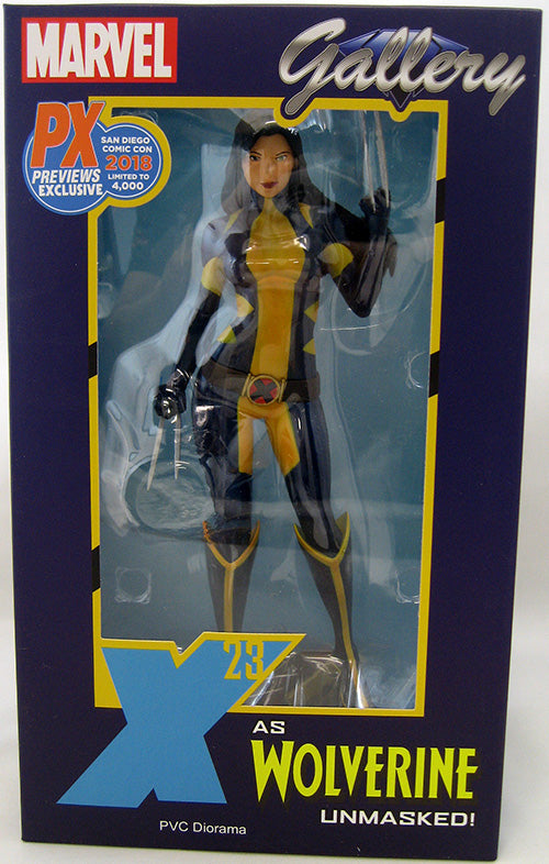 Description: She's the best there is at what she does, and what she does isn't pretty - but she is! Laura Kinney, a.k.a. X-23, a.k.a. the all-new Wolverine, removes her mask in this Comic-Con-exclusive Marvel Gallery PVC Diorama. Striking a menacing pose that contrasts with her fetching facial features, Laura stands approximately 9 inches tall atop an X-logo base, and comes packaged in a full-color window box. Limited to only 4,000 pieces!