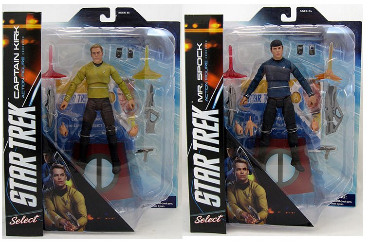 Description: A Diamond Select Toys release! The toy line everyone's waited for is finally here! Since J.J. Abrams debuted his new Star Trek universe (the "Kelvin Timeline") in 2009, fans have asked for a screen-accurate, 7" scale, fully articulated line of toys. Now, DST has brought the new timeline to the world of Select action figures! These screen-accurate figures of Kirk and Spock capture the costumes and faces of the new movies, and each features approximately 16 points of articulation, as well as multiple accessories and connecting transporter pads. Packaged in display-ready Select action figure packaging with side-panel artwork for shelf reference.