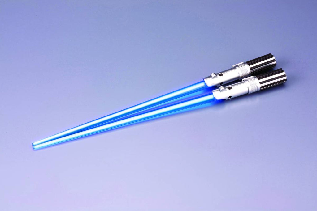 Description: From Kotobukiya! "Chop Sabers" have returned for a fourth time by popular demand! After the amazing response to the first three series of Star Wars Lightsaber Chopsticks, Kotobukiya is proud to announce a new set that includes a special new feature. Along with a Darth Vader version is the new LUKE SKYWALKER LIGHT UP VER! With a simple push of a button on the highly detailed lightsaber hilt (Jedi training not required) the "blade" glows bright blue so you'll never have to eat in the dark. With detachable lightsaber blades and a larger, sturdier size (over 9 � inches long) for easy and safe cleaning these chopsticks are fun for the whole family. Eating with these and the other new crimson Darth Vader light up chopsticks will make you never want to Use the Fork!