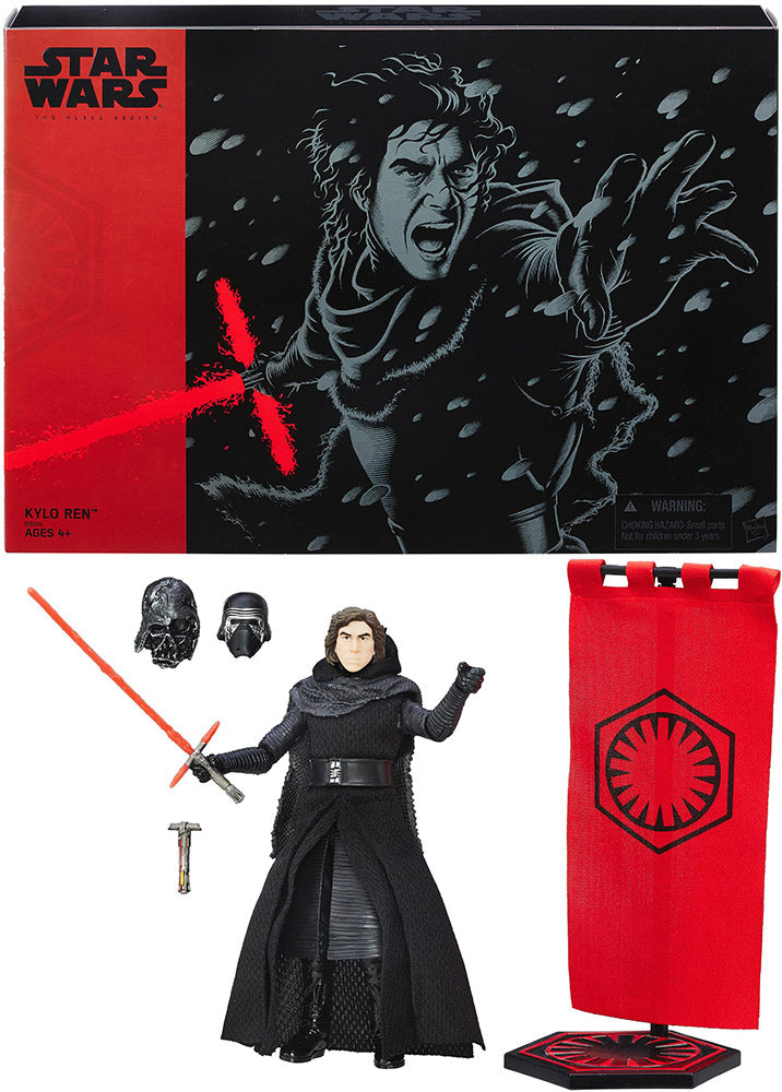 Description: Reveal the power of the dark side with this collectible 6-inch scale figure of Kylo Ren without his mask! Fans can relive the First Order commander�s most pivotal moments from STAR WARS: THE FORCE AWAKENS with accessories such as Darth Vader�s helmet and a First Order banner and stand. THE BLACK SERIES Pack features a highly articulated and exceptionally detailed Kylo Ren BLACK SERIES figure, as well as the villain�s iconic lightsaber, lightsaber hilt, and helmet.
