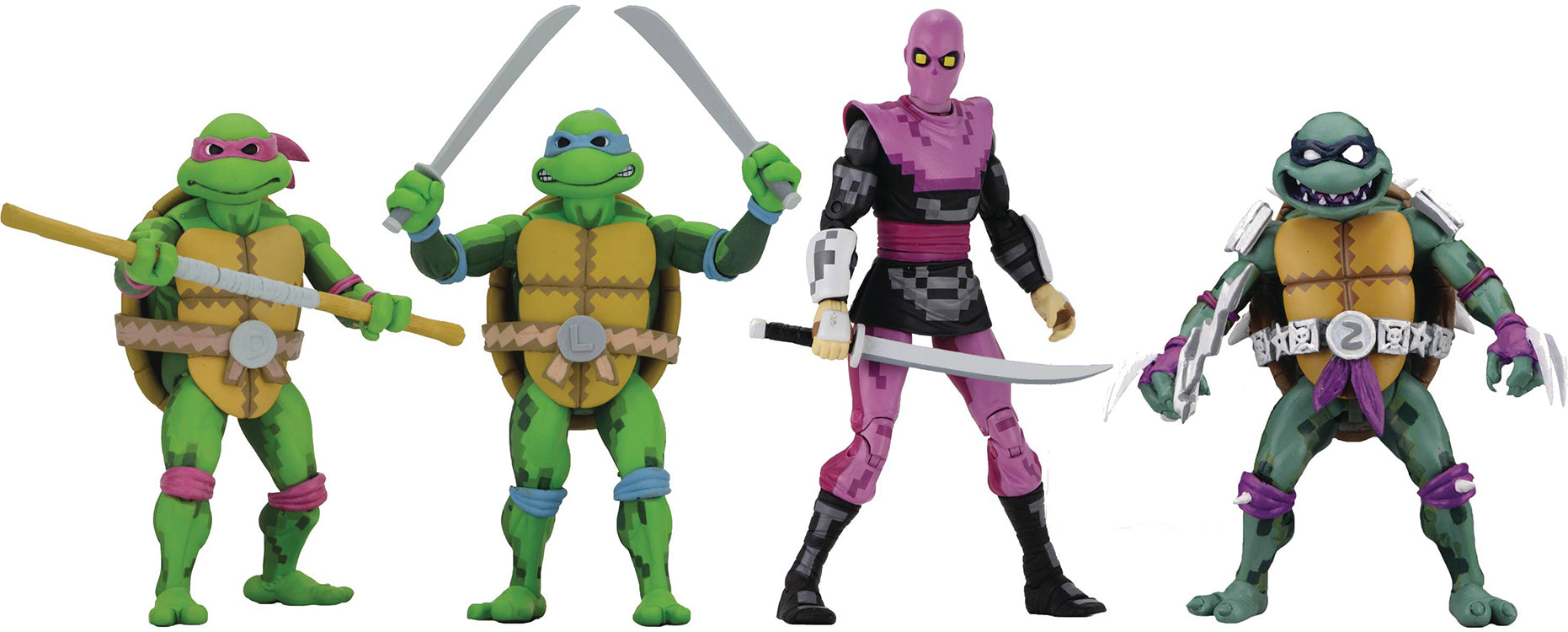 Description: Following up on NECA's first arcade game-based TMNT figures, they turn to the second Turtles game! From the classic 1990s Turtles in Time video game, NECA is excited to offer a new line-up of 7" scale action figures. Series 1 includes Donatello, Leonardo, Slash, and a Foot Soldier. Each figure comes with signature weapons and a brand new hoverboard with display stand that can be used for even more poses! The evil mutant turtle Slash comes with sword accessory. All feature special deco that recreates the pixelated look of the video game and come in individual window boxes with graphics from the original arcade cabinet.
