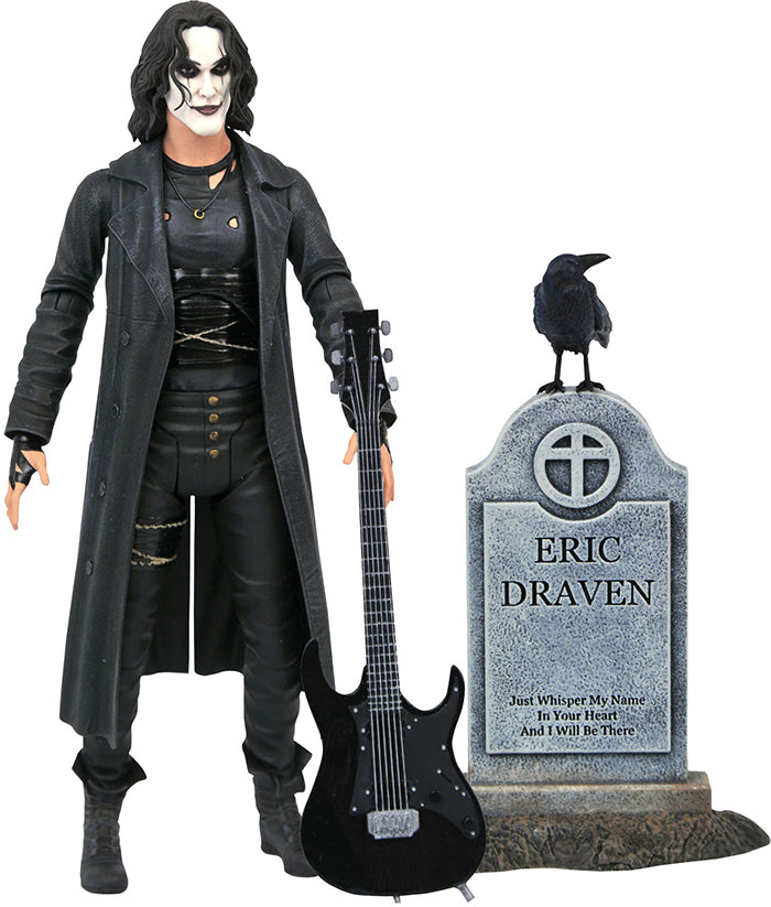 Description: A Diamond Select Toys release! Eric Draven has returned, and the Crow lives again! This 7-inch scale deluxe action figure of the Crow is based on his trench coat-wearing appearance in the 1994 movie and features 16 points of articulation. Accessories include gravestone, guitar, sword, crow and interchangeable hands. Designed by Yuri Tming, sculpted by Chris Dahlberg.