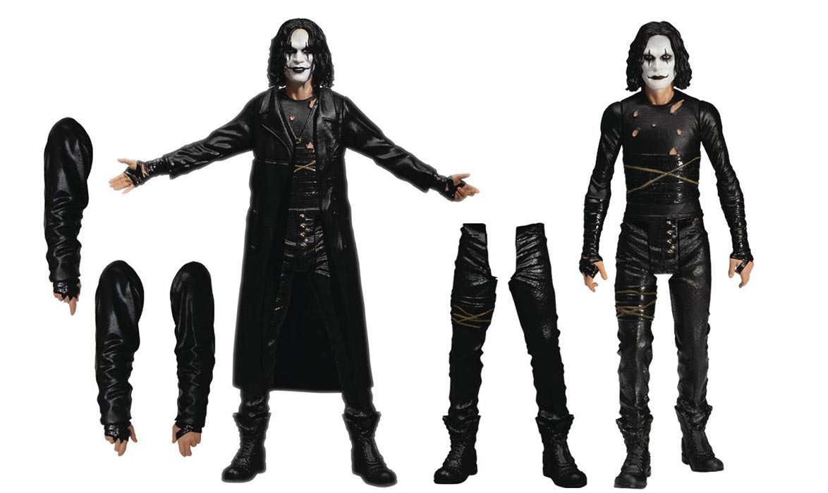 Description: This Deluxe set contains two different variations of The Crow. Version 1 of The Crow wears his signature overcoat and comes with a set of interchangeable arms allowing him to recreate his iconic pose from the film, as well as an additional right pointing arm. Version 2 of The Crow wears a distressed black shirt and comes with a set of interchangeable legs, allowing him to recreate the walking pose as seen on the film's poster. An interchangeable vengeful stare head portrait and smirking head portrait are included and fit on both versions of The Crow. The 5 Points The Crow Deluxe Set is packaged collector-friendly and designed with collectors in mind. .