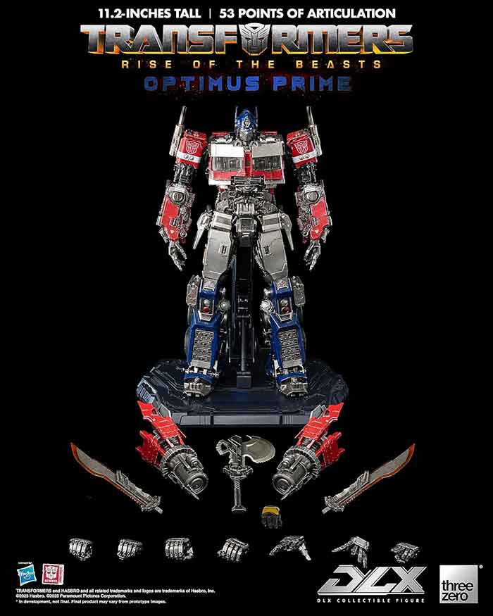 Description: Transformers: Rise of the Beasts brings us the seventh chapter in the Transformers film saga, and threezero's Transformers: Rise of the Beasts DLX Optimus Prime continues the high-quality craftsmanship of the DLX series, introducing new elements and details, faithfully reproducing his updated design and arsenal from the film. The Transformers: Rise of the Beasts DLX Optimus Prime stands approximately 11.2 inches tall, with 53 points of articulation, and contains an intricate alloy skeleton that provides a high-quality tactile feel with ample amounts of articulation. The joint design is carefully crafted with interlinking level of detail for a near seamless appearance. His eyes are equipped with LED light effects making the figure come to life, and he comes equipped with dual arm ion blasters, two Energon Swords, and an Energon Axe. There are three sets of interchangeable hands (fists, relaxed hands, and action hands), and when paired with the DLX action stand, he is capable of a large variety of iconic poses. This figure set also includes one Axe Holding Hand for Transformers: Rise of the Beasts DLX Bumblebee (sold separately) in order to recreate the memorable scene from the film when Bumblebee wields Optimus Prime's axe. Requires AG13 batteries x 6 (Batteries Not Included)..