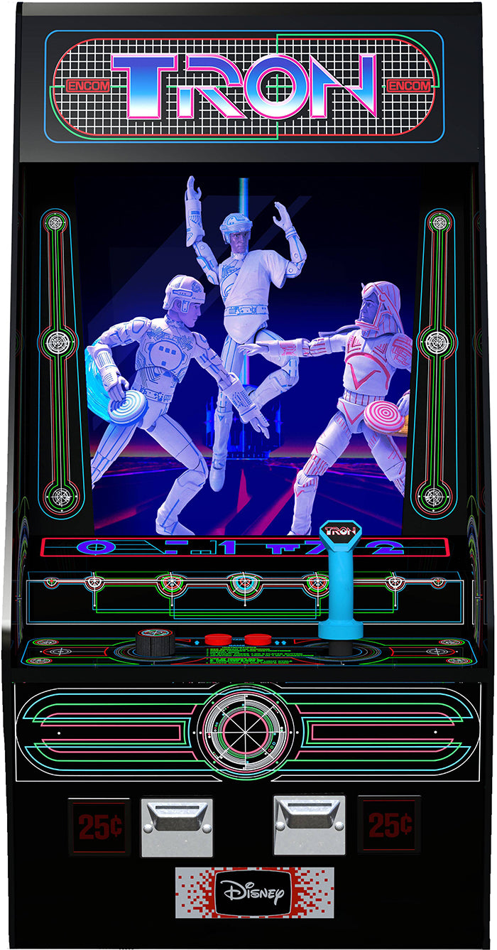 Description: A Diamond Select Toys release! Time to play the game! This new box set of Tron figures is a must-have for any fan of the movie - or the game! Tron, Sark and Flynn strike an action pose inside this replica arcade cabinet, and their UV-reactive paint glows when the internal black light is activated! Push the "Start" button and watch the figures - and the Tron logo - light up! The arcade cabinet stands approximately 17 inches tall, 9 inches wide and 10 inches deep. Each 7-inch action figure features 16 points of articulation and a disc accessory, was designed by Yuri Tming and sculpted by Gentle Giant Ltd..