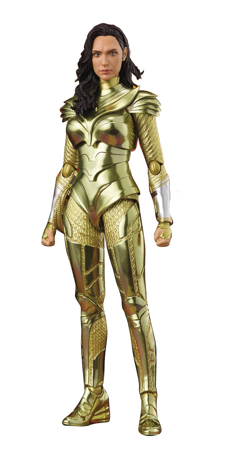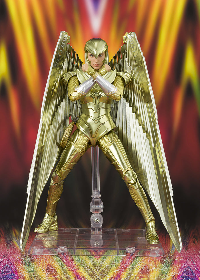 Description: From "Wonder Woman 1984," the Wonder Woman Golden Armor version joins the S.H.Figuarts lineup! In addition to the gorgeous new golden coloration, the figure includes a stand for supporting the wings in dynamic poses. Included lasso and hair options let you re-create your favorite scenes. [Set Contents] Main Body, Three optional pairs of hands, Optional head, Optional hair, Set of wing parts, Wing support rod set, Lasso of Truth, Lasso of Truth belt hook. WW84
